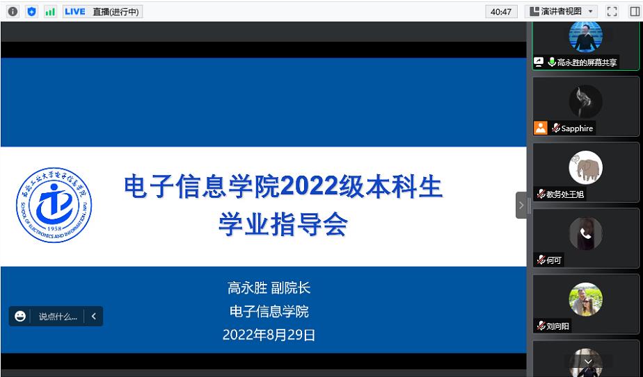 各个专业的特色和培养方向,就2022级电子信息类培养方案中学分要求、通识通修及学科专业课程设置等方面内容做了详细的解读,并为新生提供了2022-2023学年秋季学期的选课建议。