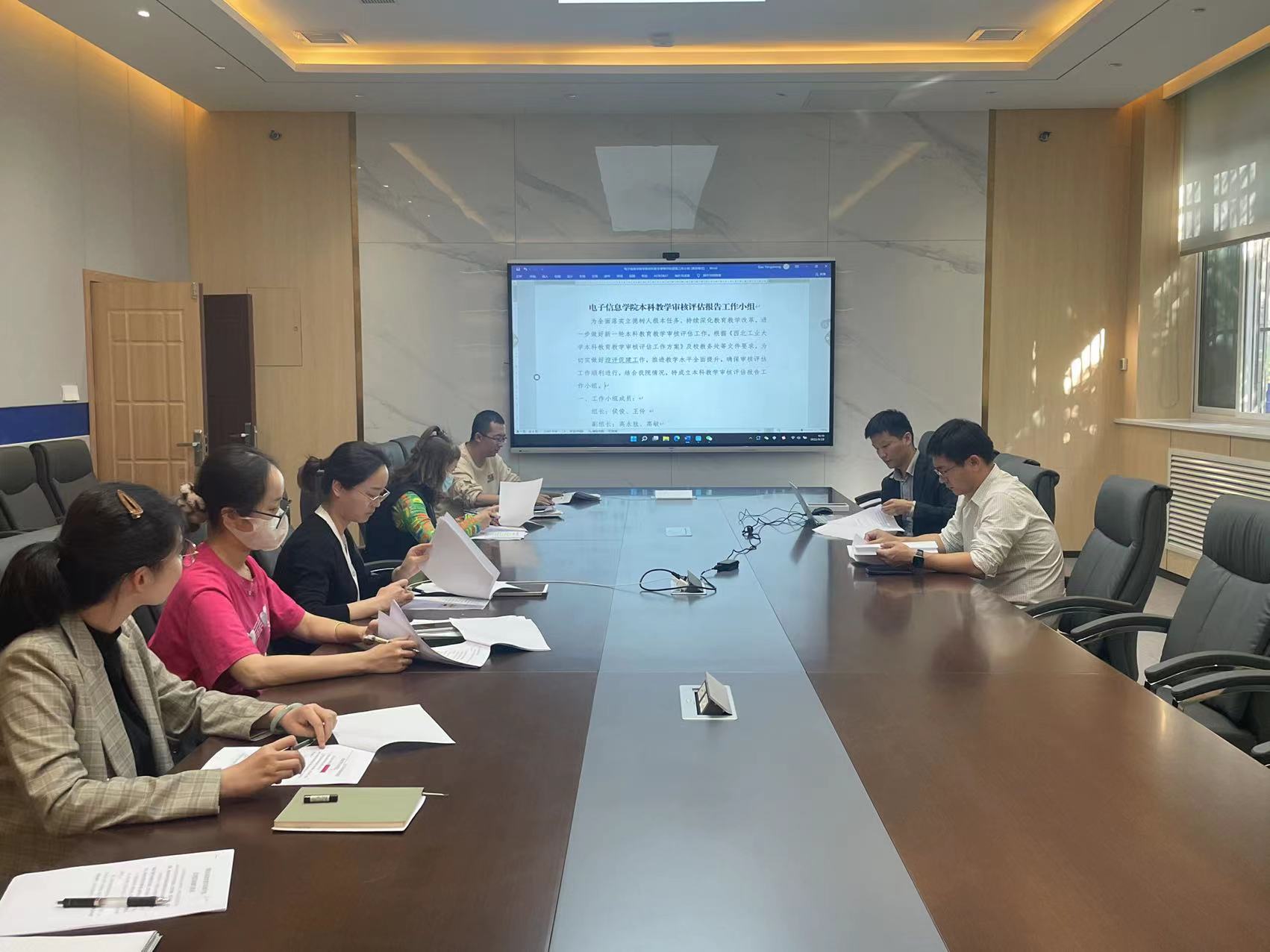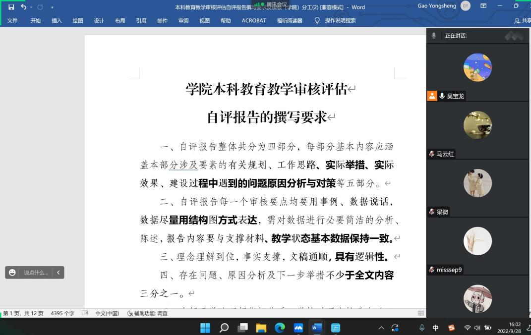 线上、线下同步召开本科教育教学审核评估自评报告撰写动员会。学院党委书记侯俊、副书记高敏(线上)、副院长高永胜、发展战略中心成员、教师代表、辅导员代表、党务秘书、人事秘书、外事秘书、本科教学秘书等参加会议。