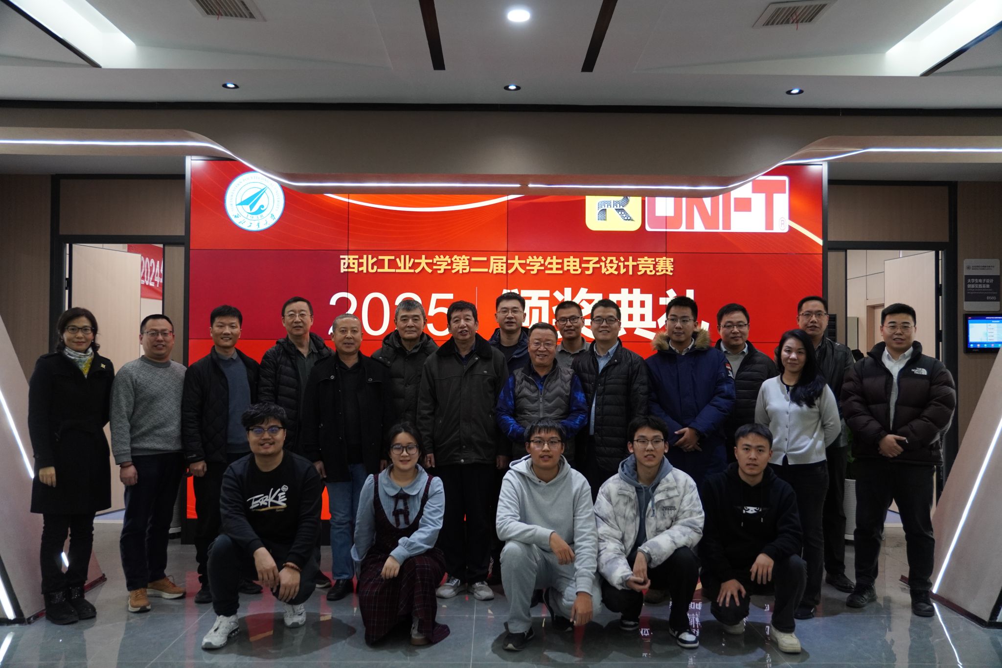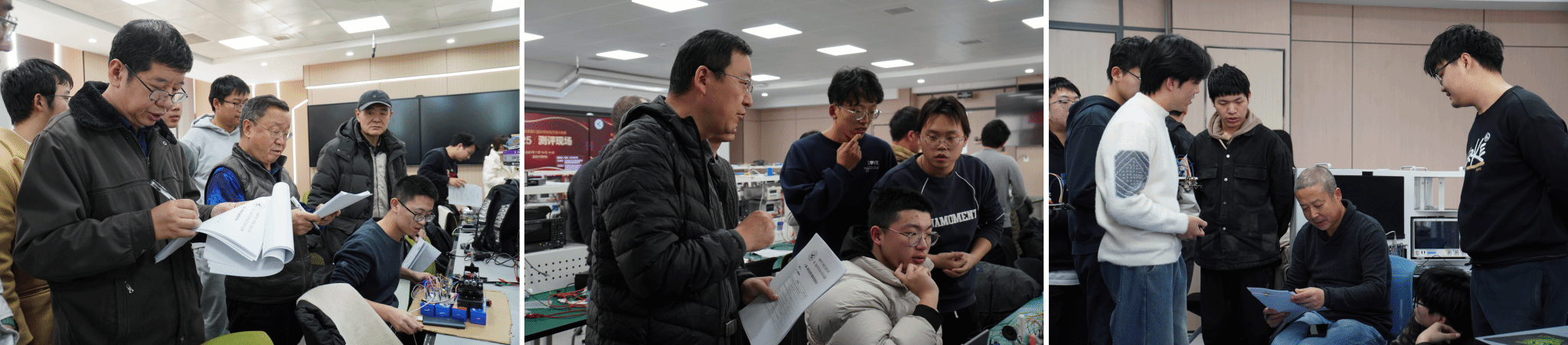 四天三夜的竞赛于1月16日落下帷幕,整场竞赛如同一场科技盛宴,让人目不暇接、心潮澎湃。每一位参赛者都用自己的智慧与汗水,书写着属于自己的电子传奇。担任此次评审的专家包括我校国家级教学名师段哲民教授、西安交通大学邓建国教授、西安电子科技大学陈南教授和陈彦辉教授、西北大学邓周虎教授。他们以深厚的专业背景和学术造诣、敏锐的洞察力对参赛作品进行了全面而精准的评审。他们不仅关注电路设计的巧妙与实用性,更看重搭建过程的规范与严谨,调试结果的准确与稳定,以及报告内容的充实与条理。