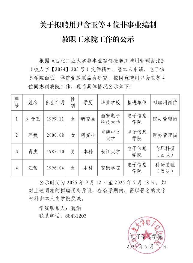 关于拟聘用尹含玉等 4 位非事业编制教职工来院工作的公示