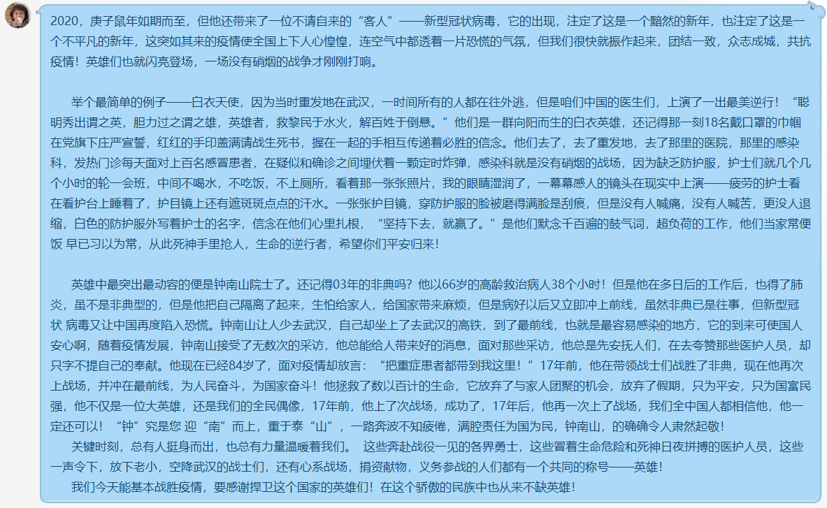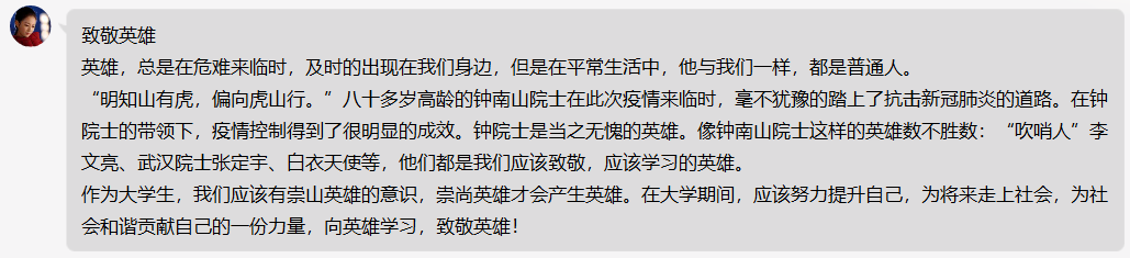 早在2003年,钟南山院士作为中国抗击非典型肺炎的领军人物,在SARS猖獗的非常时期,不但始终在医疗最前线救死扶伤,还积极奔赴各疫区指导开展医疗工作,倡导与国际卫生组织之间的密切合作。在这次抗击新型冠状病毒中,84岁高龄的钟老依然冲在第一线,在疫情面前临危不乱,在疫情期间给人们吃了一剂定心丸,获得了人民的绝对信任,这是人民心中的大英雄!作为大学生,尽管我们的力量薄弱,但只要做到自己的本职,保证学业不下滑,其次尽到社会责任如帮助中小学生辅导功课,做好网络舆情监督与舆论引导等,我们依然是这场战“疫”中的小英雄!