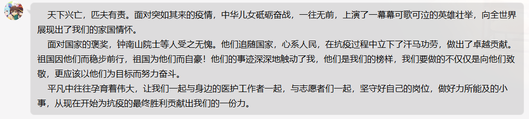 面对疫情,中国人民团结一心,积极响应国家的号召,共同坚守,驱逐病魔。在这场大考中我们看到了“中国力量”:全国上下众志成城,同舟共济,精准施策,形成了强大合力,打响了这场疫情防控人民战争、总体战、阻击战;科研人员攻坚克难,医护人员坚守担当,志愿者们无私奉献,他们每一个都是英雄,他们的勇敢无私值得我们崇敬。在这场战“疫”大考中,我们每个人都是答卷人。无论来自何地、无论身处何方,既是休戚与共的命运共同体,也是责任共同体,每个人都是一道防线。任何困难都难不倒英雄的中国人民,此次疫情得以控制也再次印证了这句话的正确,在深感自豪的同时,身为青年的我们更应树立远大理想,奋发图强。我们要坚定信念,把自己的理想同祖国的前途、民族的命运紧密联系在一起,扎根基层、奉献国家,在逐梦路上脚踏实地、行稳致远。