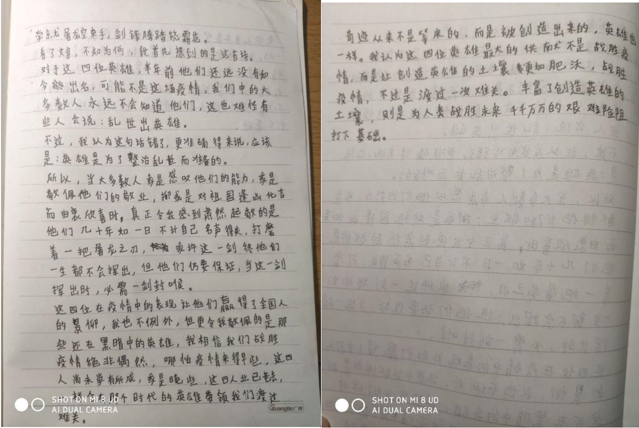 生活中总有一些人带给我们感动,给寒冬带来温暖,让炎夏不再燥热,使我们充满信心,让生活富有希望。在抗击新冠肺炎疫情的斗争中,涌现了一大批的人民英雄,他们承担了巨大的压力,承载着人民的希望,用知识和技术奉献祖国。这场疫情中,我看见了英雄的勇敢,生命的脆弱,知识的力量。敢问自己,当我们面对危难时,是否有勇气、有能力去承担这份责任?2020年,我们20岁了,正处于一生的黄金时代,作为当代青年,我们有梦想、有朝气,却容易忽略了此时此刻,生活就在于当下的每一天,时间稍纵即逝,希望我们所过的每一天都有勇气,让我们回首往事时,有为之骄傲的故事可诉说;让我们在属于自己的领域,能像那些英雄一样,有足够的能力担当和奉献,在保卫国家和中国特色社会主义建设中做出自己的贡献。