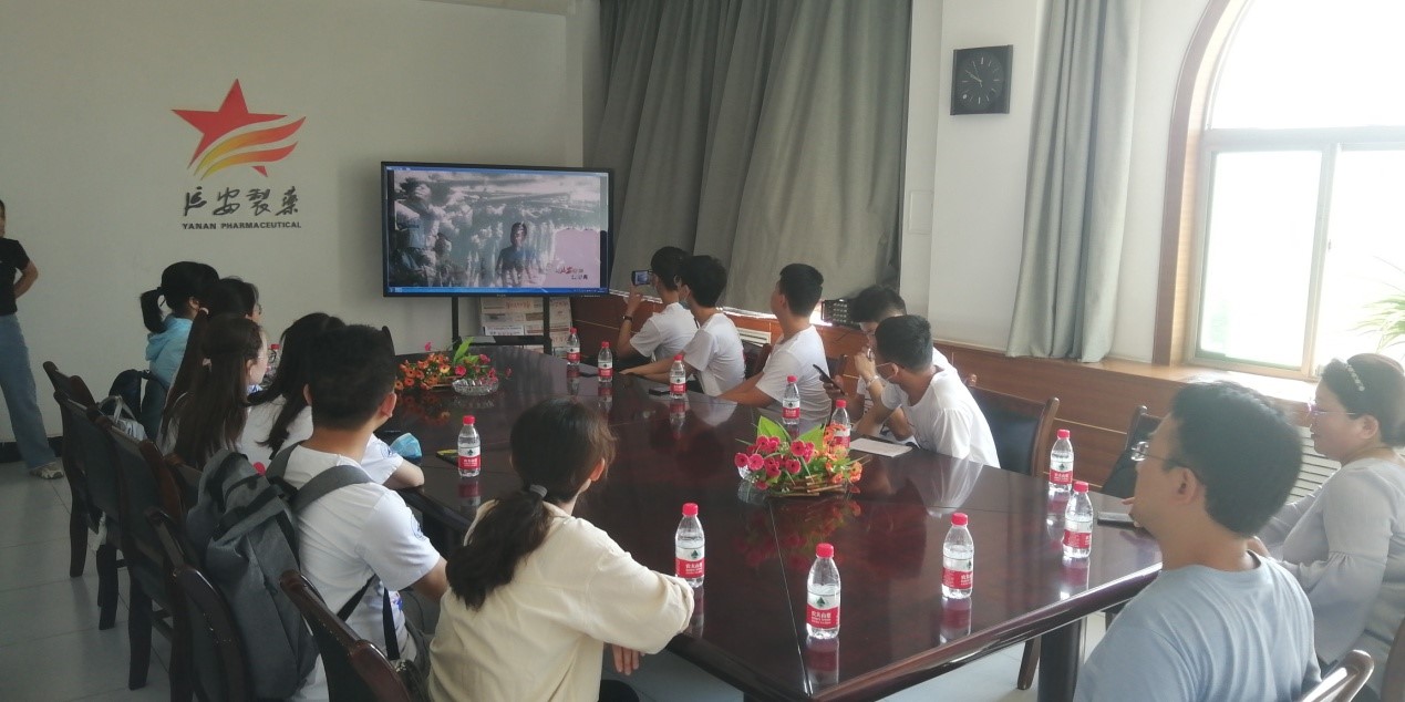 下午,折经理带领队员们观看了一部关于延安常泰制药厂的纪录片。通过观看,队员们能更加深刻的感受到该公司浓郁的历史底蕴。毛主席曾题词,“制药疗伤,不怕封锁,是战胜敌人的条件之一”,朱德总司令曾为药厂题词,“加强团结,努力生产,多造药品,输送前线,医好战士,打大胜仗”,继承了无数革命历史的制药厂,影响了一代又一代的延安制药人。