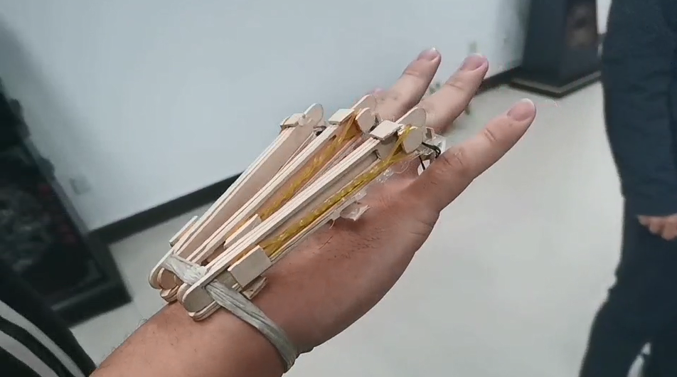 本作品灵感来源于漫威金刚狼,作品以木棒为主要材料,同时,使用少量塑料片及橡皮筋制作触发装置和动力装置。不同于电影设定,此爪为简易的机械外骨骼,通过爪子上的小楔形块和挡板将三根爪子固定在刀鞘中,使用时,拉动绳子,控制塑料片带动挡板脱离楔形块,使三根爪子从刀鞘中弹出,使用完毕后可将爪子重新收回刀鞘并固定。本作品的特色在于在用材极简的同时,保证了此爪的基本性能,可满足平时的娱乐需求,具有很好的观赏性及科技性。