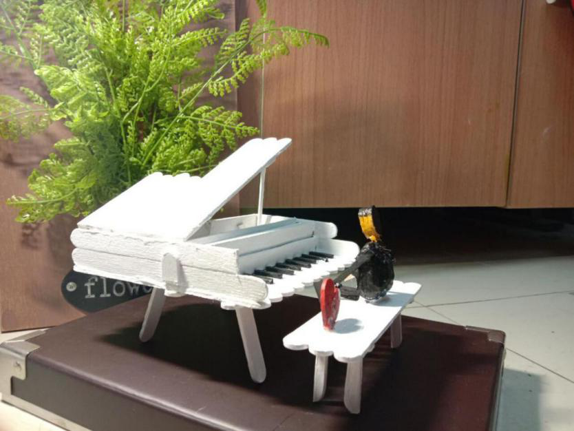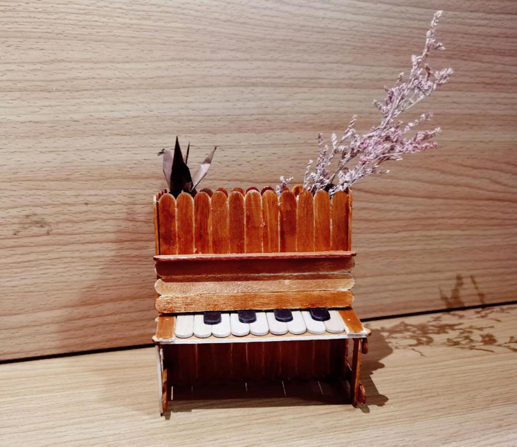 “我们组的作品是一架钢琴,通过对雪糕棒进行上色处理,打造出了一种木制的古典美。作品本身是一件精巧的工艺品,我们可以把它摆放在我们的桌子上,提升我们的审美和幸福感。”