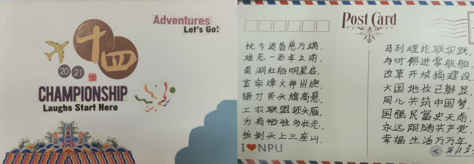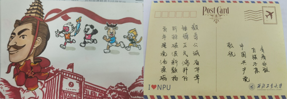 委员会、共青团民航学院委员会共同承办的第一届“绘五四精神,书时代赞歌”明信片DIY活动在全校师生的期待下拉开了帷幕,在为期12天的明信片创作过程中,各位同学牢牢把握五四精神传承,建党百年与十四运的时代主题,在小小的明信片上通过绚丽的色彩与细腻的文笔,传达出了新时代青年的青春气息,展现出了新时代青年的坚定信念与敢于拼搏的时代精神,流露出对祖国,对党和人民由衷的热爱。