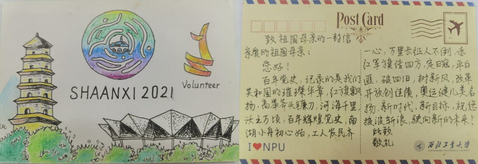 活动开始之后,全校师生广泛参与,积极报名,提交了多份精美的明信片作品。他们在空白之处,将十四运会徽与吉祥物重新架构,结合时代精神与地域特色,创作出丰富多彩的图案,惟妙惟肖。明信片背面,参赛同学或咏诗,或写信,节奏丰富,情真意切,体现出浓浓的爱国之情,展现出昂扬进取的青年风貌。