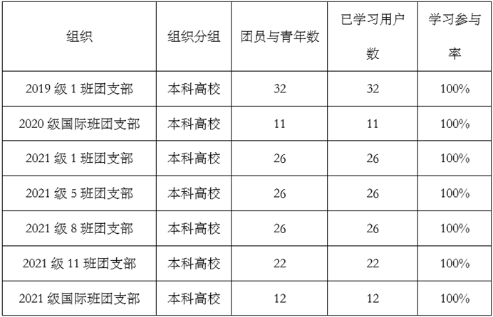 在本期学习中,本科支部19级,20级,21级学习完成率总体较高,其中有7个班级完成率达到100%,它们分别是2019级1班团支部、2020级国际班团支部、2021级1班团支部、2021级5班团支部、2021级8班团支部、2021级11班团支部、2021级国际班团支部,在此对这些班级提出表扬!希望所有团支部在青年大学习过程中向它们看齐,不断进步,越来越好!