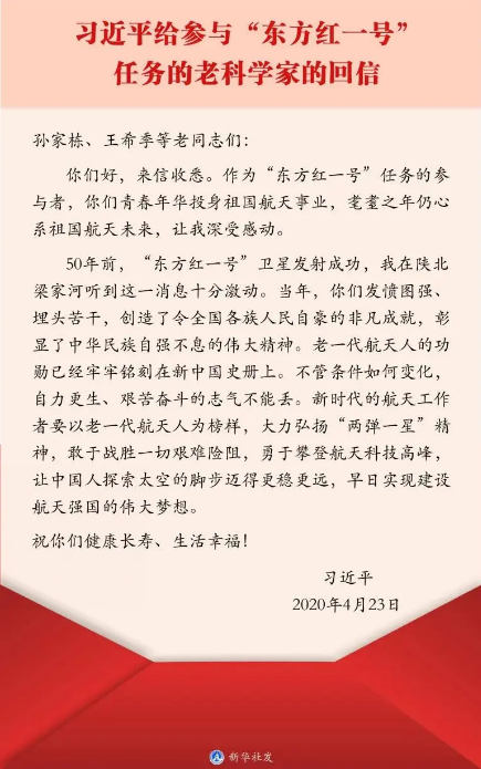2020年4月23日,习近平总书记给参与“东方红一号”任务的老科学家回信中再次肯定了“两弹一星”精神,不管条件如何变化,自力更生、艰苦奋斗的志气不能丢。