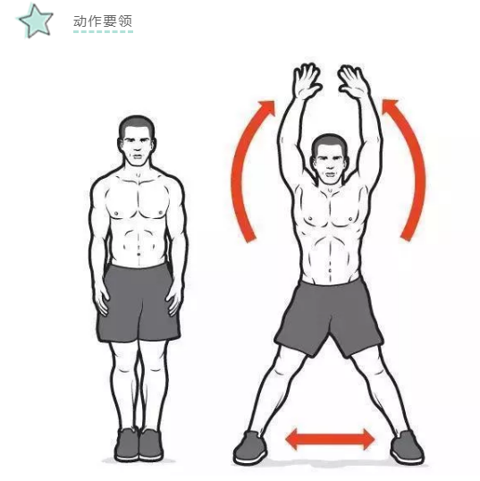 全程核心收紧,双手双脚协调开合,保持动作整体的弹性。落地时,膝盖顺势微曲缓冲,尽可能的让肌肉来吸收压力。