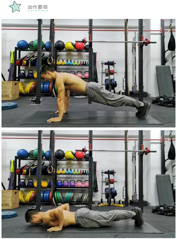 起始姿势为标准直臂平,慢慢屈肘把身体放低,保持核心臀部收紧,头、肩、腰、脚踝在同一直线上,身体下降到大臂基本平行于地面,发力把自己推回起始的直臂平板姿势,重复练习。