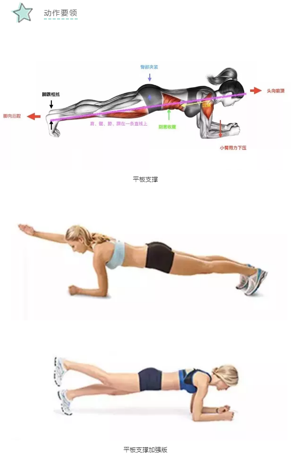 平板支撑加强版:核心收紧,平板支撑基础上可悬空提起一只脚或一只手。