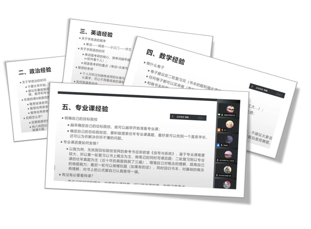 杨楠同学建议政治课的学习不要太早开始,但也不能“临时抱佛脚”,同时,他推荐了徐涛老师视频课、肖秀荣精讲精练、肖秀荣1000题作为考研政治的重要学习资料。在英语的学习上,他推荐按照“单词-阅读-小三门-作文”的顺序进行有规划的学习,并讲解了刷真题的技巧。在数学的学习上,推荐了汤家凤老师(高数)、李永乐老师(线代)和王式安老师(概率论)的课程,并嘱咐同学们在听课时一定要做好笔记,方便后续复习。在专业课的学习上,建议同学们要尽早明确自己的目标院校,通过各种可能的途径搜寻往年专业课真题进行练习。