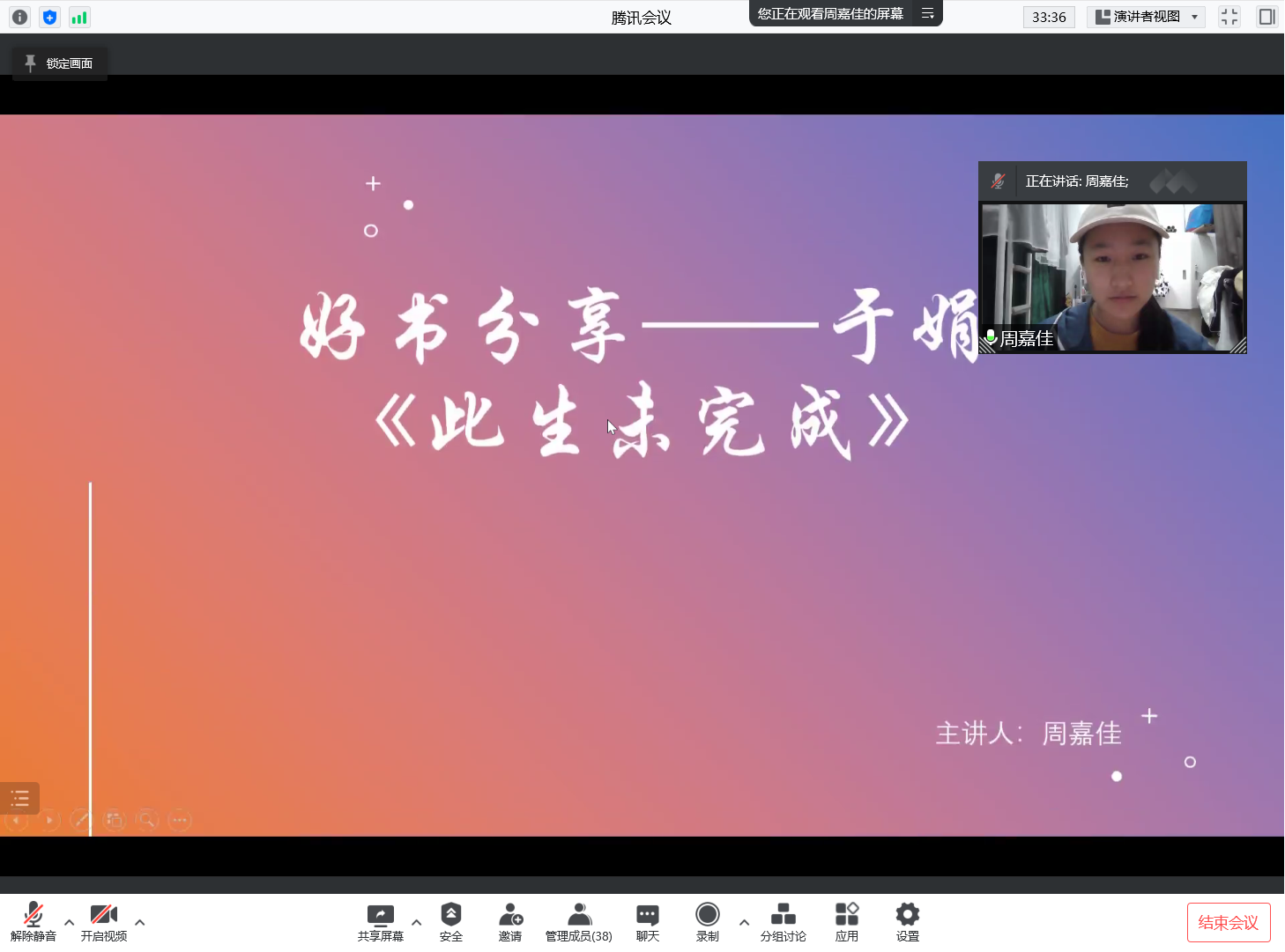 4月15日晚上,由我校党委学工部主办,动漫在线 承办的“微拓”-WE TALK学术沙龙第150期通过线上会议的形式举行。本次活动主题为“好书分享—于娟《此生未完成》”,主讲人周嘉佳是动漫在线 2020级本科生,曾获国家励志奖学金、校二等奖学金以及社会服务先进个人、学业先进个人、“优秀共青团员”等荣誉表彰。