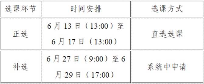 在校本科生可直接在教务系统中选课,选课分为正选和补选,正选于6月13日13:00开始,6月17日13:00结束,补选于6月27日9:00开始,6月29日17:00结束。研究生选课请加入相应课程QQ群进行报名,报名时间自本通知发布日起至2022年6月26日。