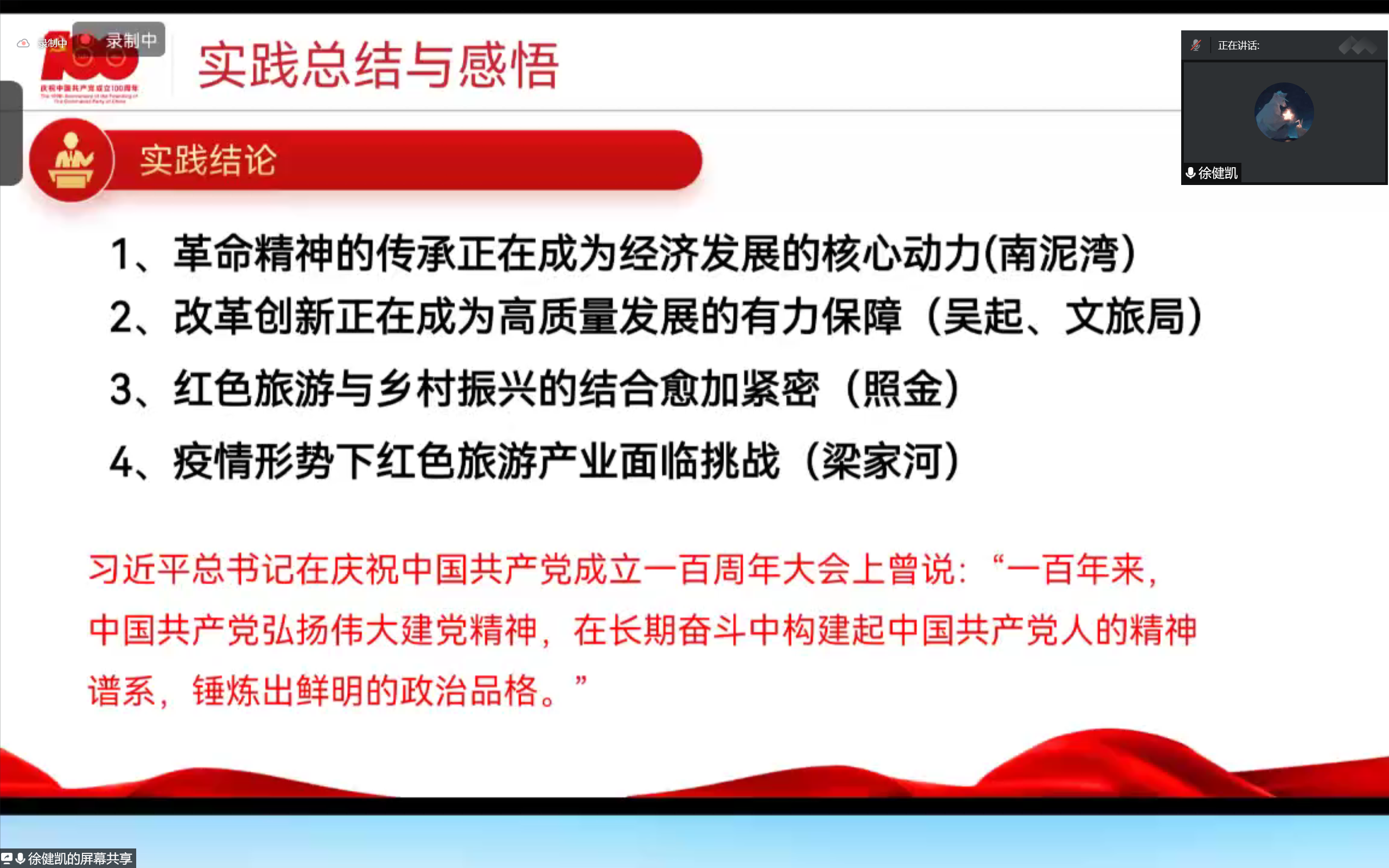 徐健凯展示了21年暑期社会实践“辉煌百年路-革命精神的赓续传承”实践队优秀案例,向同学们介绍了从选题、前期准备、实践过程到最后的总结与感悟,深入浅出,为同学们提供了宝贵的经验。