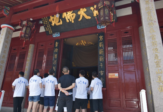 上午,部队政委、干事等相关人员与实践队师生展开交流,部队领导表达了对实践队师生的欢迎并介绍了部队的基本情况,随后带领实践队前往鼓山景区进行游览。登“鼓顶”可览福州全貌,队员们在部队领导的带领下参观了历代文人骚客携工匠登鼓山留下的笔墨,其中最振奋人心的当属叶剑英元帅亲笔题词“以山为家,以苦为荣”,战士们不惧艰苦也要上山扎“根”,励志投身国防的精神令队员们动容。鼓山半山腰有一座寺庙名为涌泉,1699年康熙颁赐的御书“涌泉寺”泥金匾额,高悬于天王殿寺门之上,涌泉寺隐于山中,有“进山不见寺,进寺不见山”之说,寺内有“知恩报恩”四个大字,两个“恩”字前小后大,告诫世人要心怀感恩,心怀善念,滴水之恩涌泉相报。