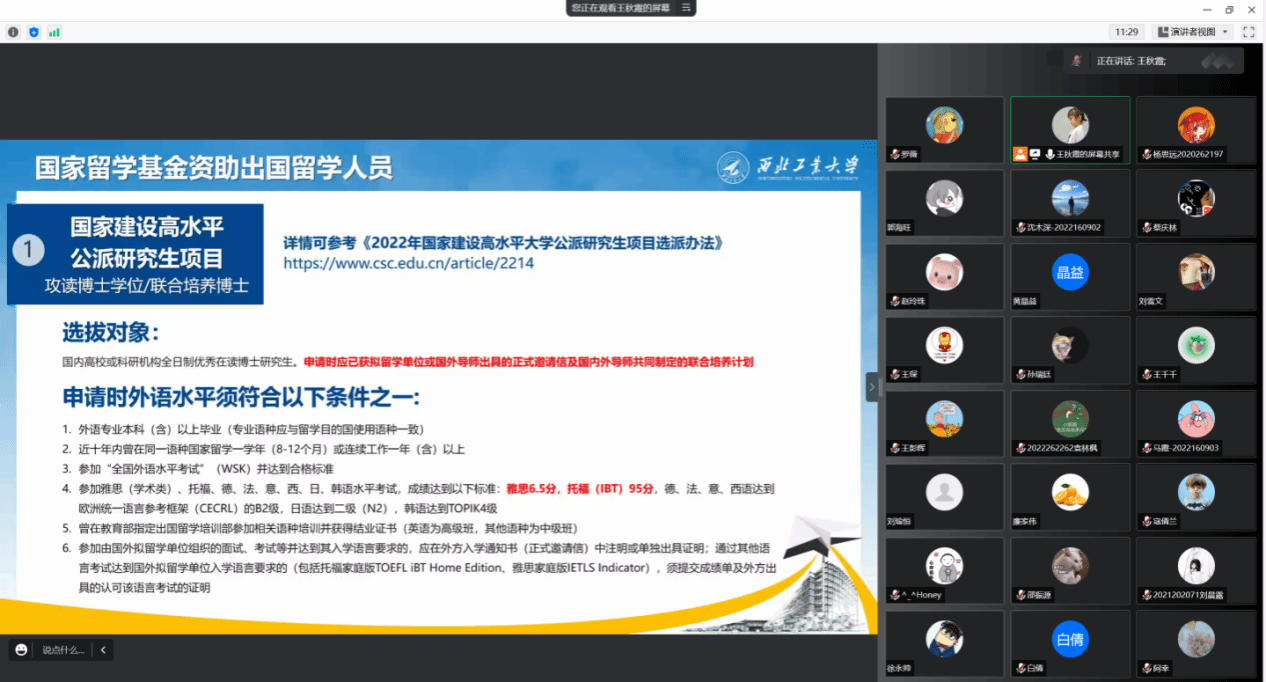 为帮助学生进一步了解赴国(境)外交流的相关政策,提升学生国际视野,2022年9月20日晚上8点,动漫在线 召开研究生赴国(境)外交流项目线上宣讲会,学院国际化秘书王秋霞老师详细介绍了研究生赴国(境)外交流的相关项目政策及流程办理,学院硕博各年级近百名学生线上参会。