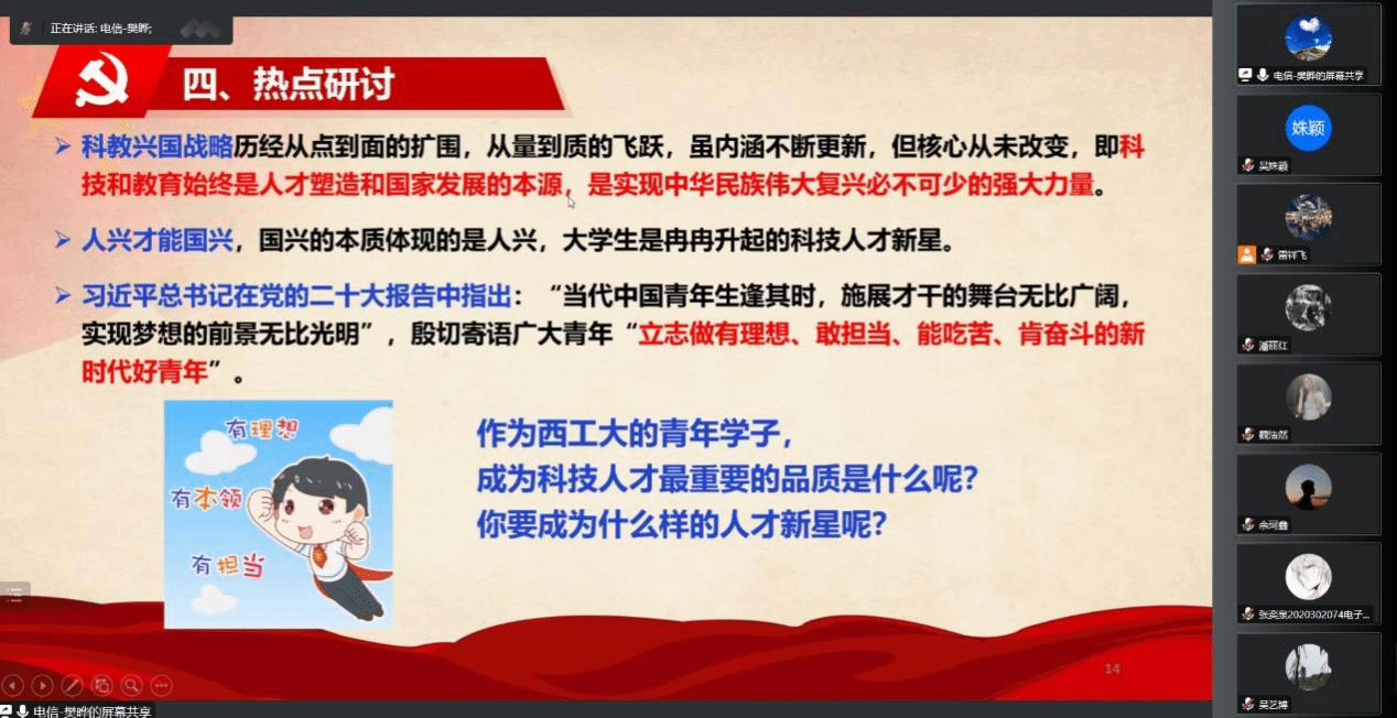支部书记樊晔同志首先结合报告内容,分析和解读了科教兴国战略在新时代的科学内涵和使命任务。党的二十大报告强调科教兴国战略,并将科教兴国战略、人才强国战略、创新驱动发展战略摆在一起,将教育、科技、人才整合到一起进行系统谋划,共同服务于创新型国家建设。樊晔同志强调,作为新时代的青年,我们要不畏艰难、守正创新、勇担责任,为建设社会主义现代化强国而奋斗。