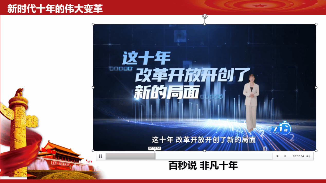 支部党员潘丽红同志结合党的二十大报告,带领与会党员一同学习。她讲到,习近平总书记在党的二十大报告中回顾了过去五年的主要工作,总结了新时代十年的伟大变革。新时代十年的伟大变革离不开十年前改革开放和社会主义现代化建设取得的巨大成就。潘丽红同志分享了视频《百秒说·非凡十年》,用一百秒的时间,高度概括总结了新时代十年在各个方面的伟大成就,同学们纷纷感受到中国速度、中国成就正在惊艳世界。