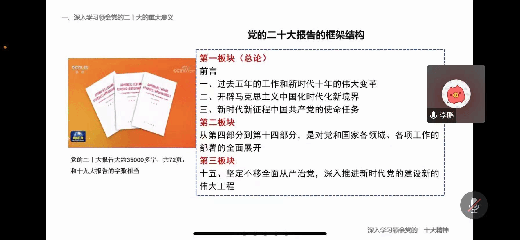 最后,李鹏希望同学们要努力学习、全面体会理解党的二十大精神。要不断加深对党的认识,更要坚定跟党走的决心。在今后的工作学习中,我们一定要对党绝对忠诚,做政治上的明白人,在党的领导下,迈上新征程,做出新贡献。