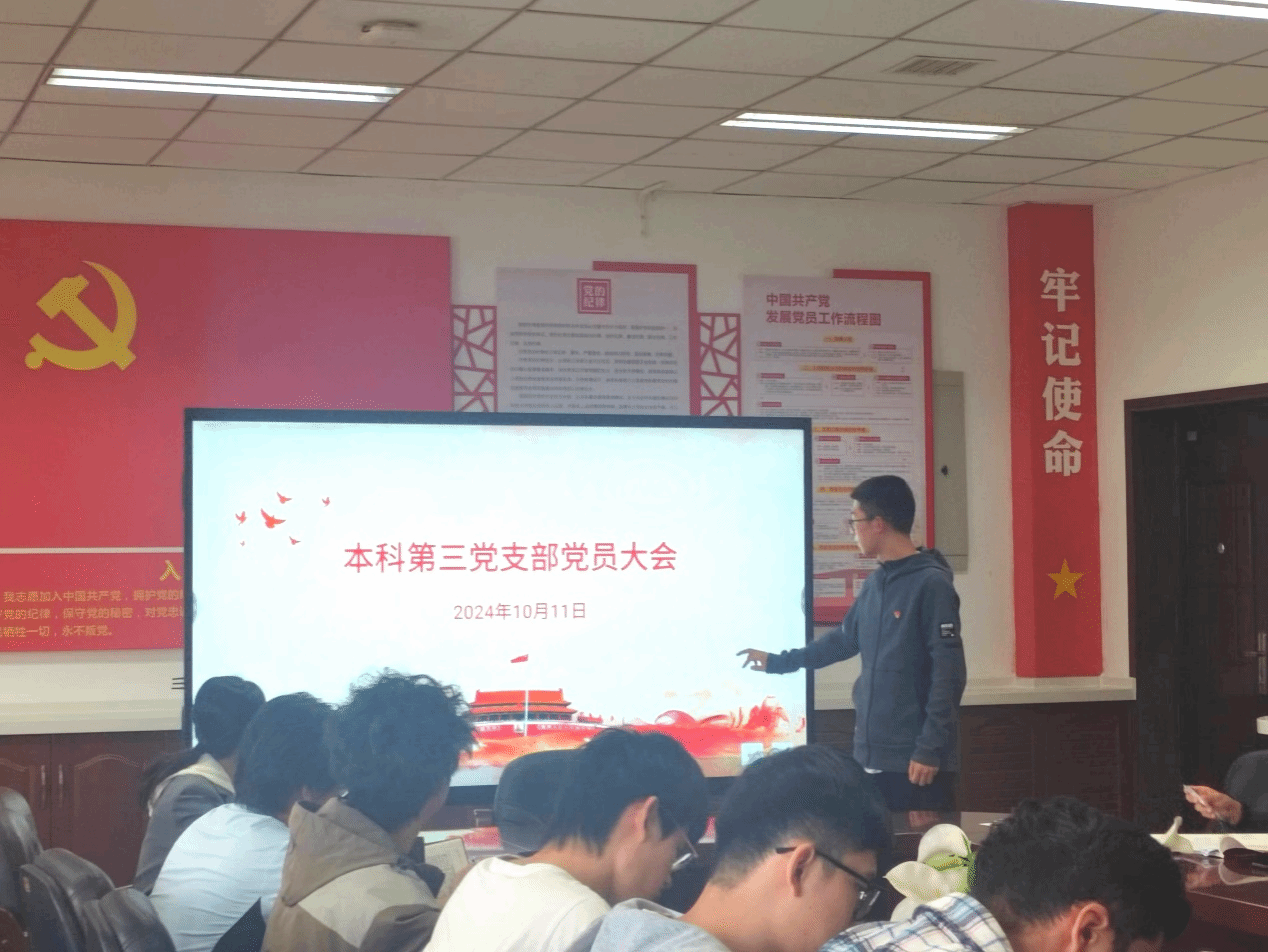本科第三党支部注重党员基础理论学习与探讨,通过开展“党的二十大精神重点研读”“热点问题研讨式”等系列学习,以理论与实践相结合的方式学习宣传、贯彻落实党的二十大精神、习近平新时代中国特色社会主义思想。党代会开幕之际,支部副书记李佳庆以党课的形式带领支部党员深入学习贯彻党的二十届三中全会精神,感受新时代全面深化改革的重大成就以及进一步全面深化改革的重大原则和各项举措,坚定道路自信、理论自信、制度自信、文化自信,引领支部党员为推进中国式现代化,实现中华民族伟大复兴贡献自己的力量。
