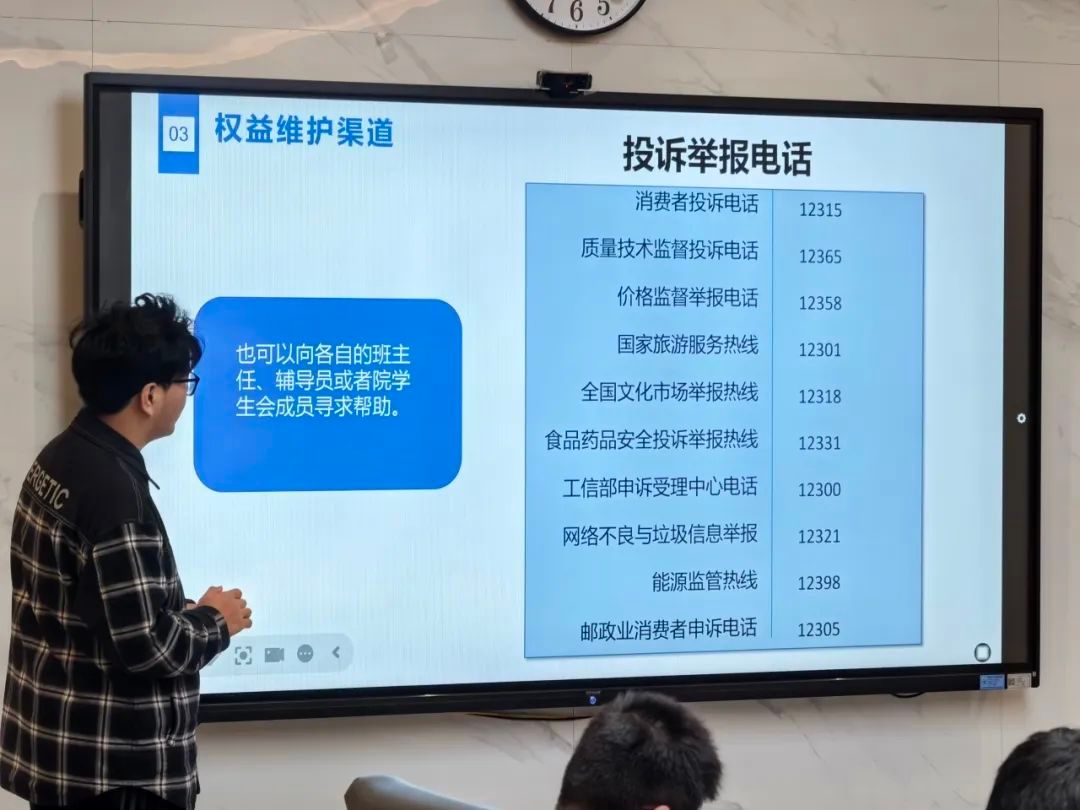 主讲人强调,除了了解侵权案例,掌握维权手段同样重要。主讲人提供了针对我校同学的多种维权渠道,包括翱翔门户留言板,院、校学生会权益反馈问卷等,以便同学们能够及时反馈问题。此外,主讲人还给同学们提供了一系列投诉举报电话,如消费者投诉电话12315等,以便在遇到问题时能够迅速寻求帮助。