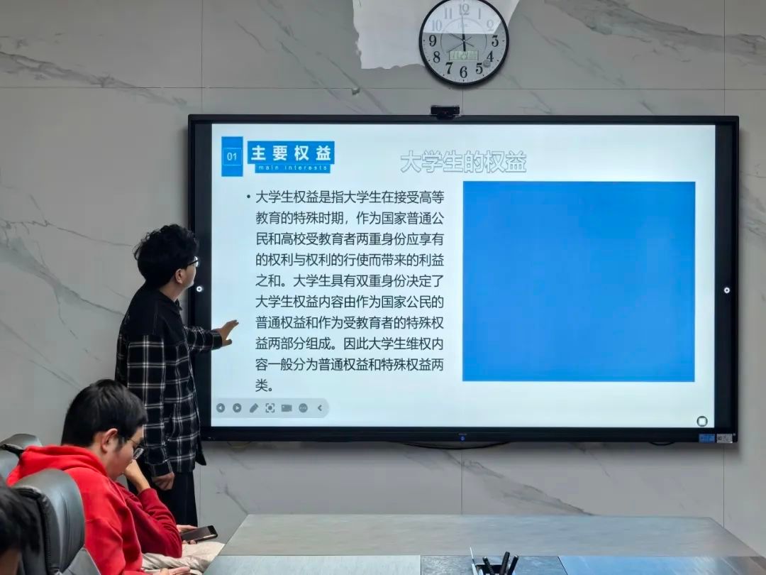 活动开始,主讲人讲解了大学生作为国家公民与高校受教育者的双重身份所赋予的广泛权益,包括生命权、健康权等基本人格权,和财产权、参与权、知情权、申诉权以及奖贷权等权利。