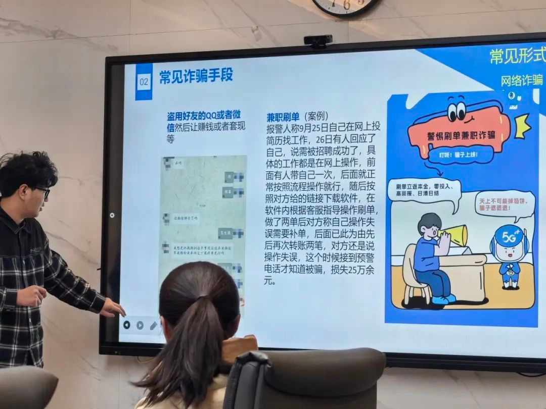 接着,为了提高同学们的防范意识,宣讲会通过真实案例展示了不法分子的侵权和诈骗手段。主讲人以商品推销、网络诈骗等场景为例,揭示了不法之徒如何利用同学们的同情心和信任进行欺诈。