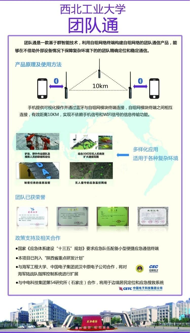 《国家突发事件应急体系建设“十三五”规划》中指出,强化应急通信保障能力,应急队伍配备小型便捷应急通信终端。现有对讲机等地面无线电通信设备无法在山地环境下进行远距离传播,本项目采用3D打印技术制造微型折叠无人机,研发了飞控电路板和组网通信模块,使得该无人机能够放入背包,在遇险求救和搜救时,能够垂直升空和大范围搜索,将求救信号在山地环境中进行大范围传播,极大增强了获救概率。