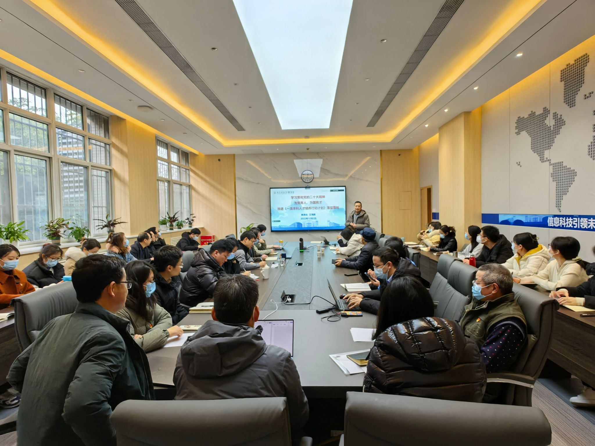 特邀学校党的二十大宣讲团成员、教务处处长王海鹏到学院进行党的二十大精神宣讲。本次宣讲活动在学院楼119会议室举行,由学院党委书记侯俊主持。院长王伶、党委副书记高敏、副院长姚如贵、张洵颖、高永胜以及各教师支部委员、学院办公室人员、非党员青年教师参加了宣讲会。会议通过“线上+线下”相结合的形式开展。