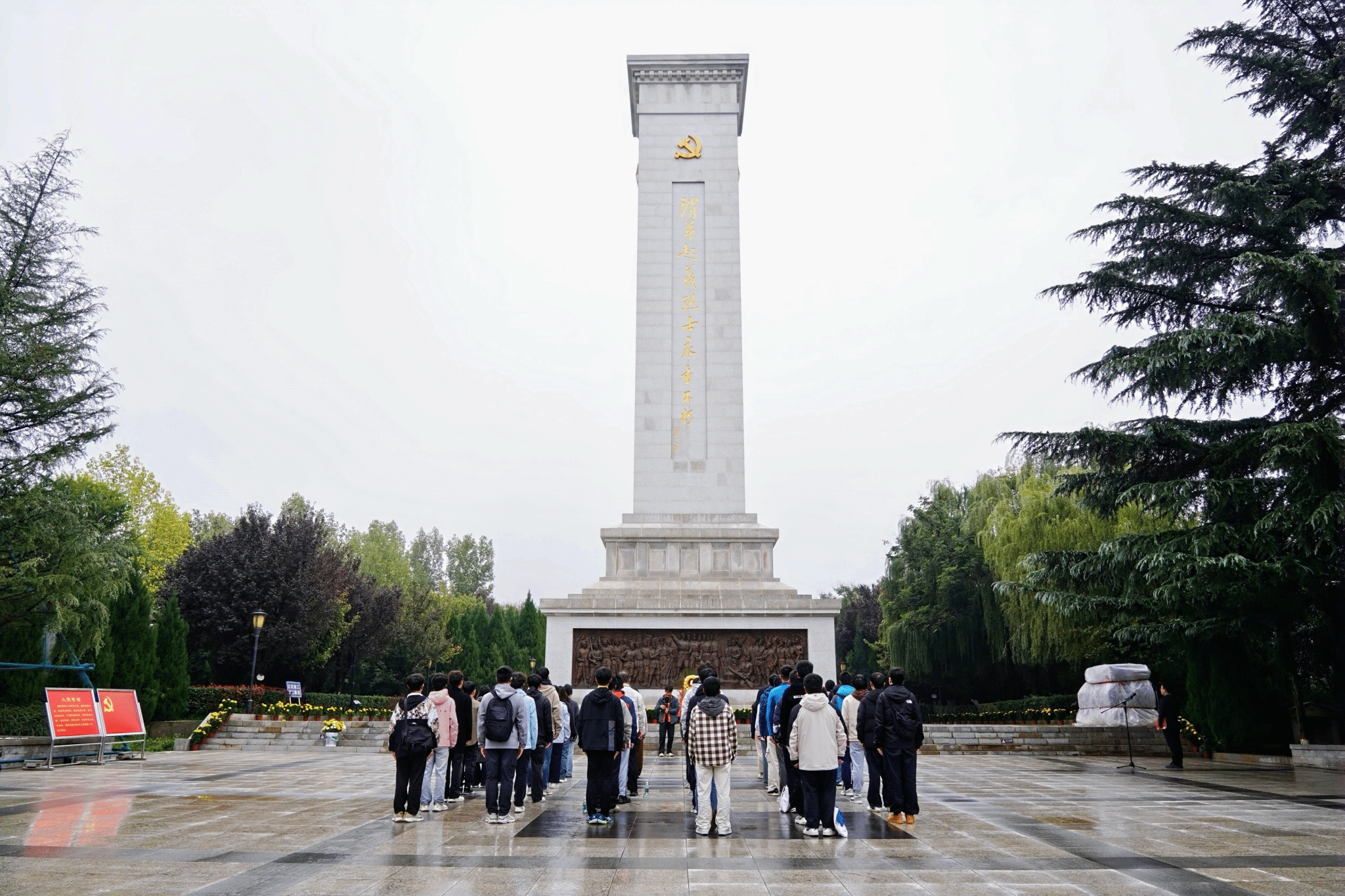 上午10时,在渭华起义烈士纪念碑前,敬献花篮仪式庄重举行。国歌响起,全体师生肃立。随着《我爱你中国》的旋律缓缓响起,师生手持菊花,绕碑缓行,静默瞻仰,追忆革命先辈的峥嵘岁月,并行鞠躬礼致以崇高敬意。