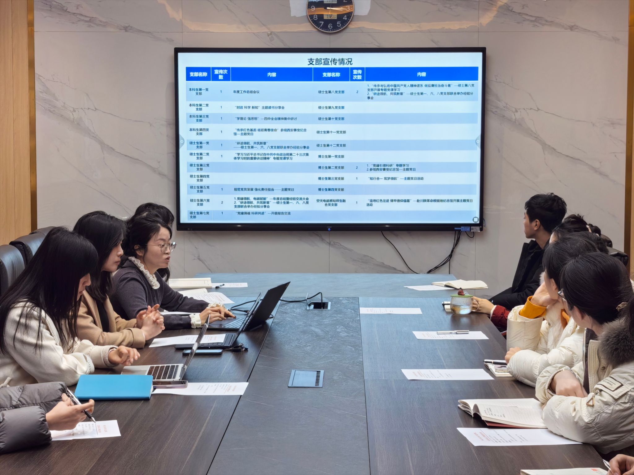 王心怡介绍了“一支部一品牌”工作进展,并就当前存在的问题进行分析。高敏谈到,各支部应结合不同学历阶段学生的特点,积极学习其他兄弟院校的好经验、好做法,将支部品牌建设做实做深,形成具有辨识度和影响力的支部特色。