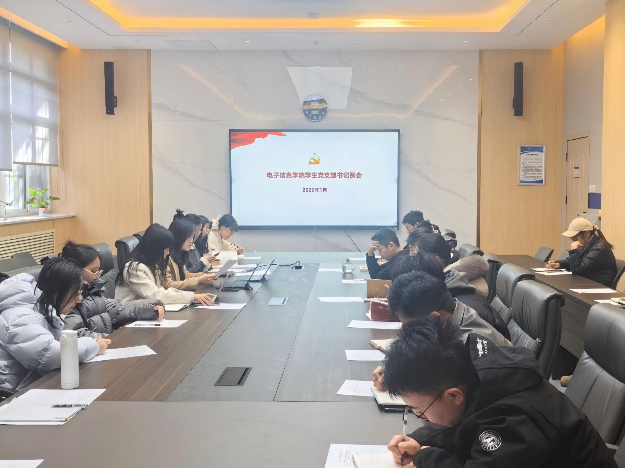 在119会议室召开学生党支部书记例会。会议围绕支部品牌特色化建设路径、先进典型挖掘培育重点和年度考核要点进行了安排和研讨。会议由党委副书记高敏主持。学工主管程姣姣、党务秘书王心怡、部分兼职辅导员及全体学生党支部书记参加会议。