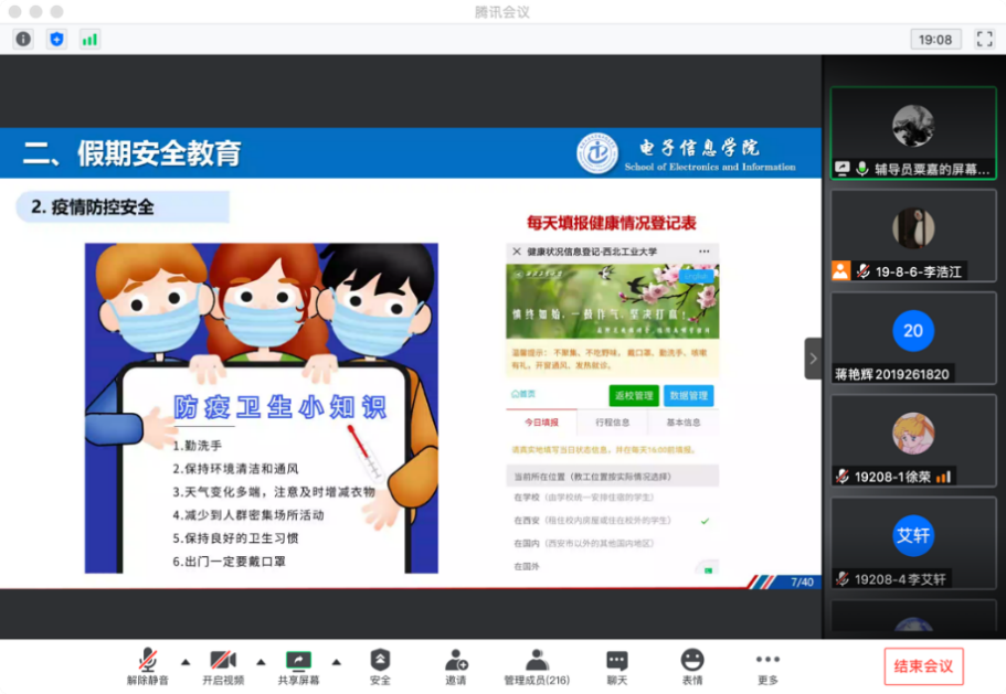本硕博各年级辅导员先后通过线上的方式召开了大班会,开展暑期学生安全教育,内容包括:学生离校前彻底清理宿舍卫生并检查宿舍安全,关好门窗、关闭房间电源,彻底消除安全隐患;假期内外出要注意防疫安全、人生安全、财产安全、交通安全,避免前往中高风险区域,不参与大规模集会活动,做好安全防护工作;留校学生不得随意出入学校,有事外出需告知辅导员并请假,返校需销假;学院对留校学生坚持疫情“日报告、零报告”制度,每天对留校学生进行全面精细排查;注意网络安全与文明,禁止使用网络暴力,维护网络环境稳定。