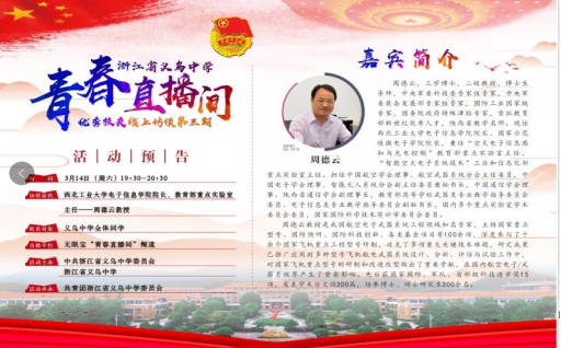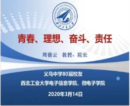 院长周德云教授(义乌中学81届校友)做客义乌中学“青春直播间”,线上与义乌中学全校学生分享了以“青春、理想、奋斗、责任”为主题的宣讲报告,并通过在线访谈、在线互动交流等环节,指导同学们在延迟开学期间合理有序地安排生活,在网络学习中科学高效地利用学习时间,并为未来生涯规划提供方向。