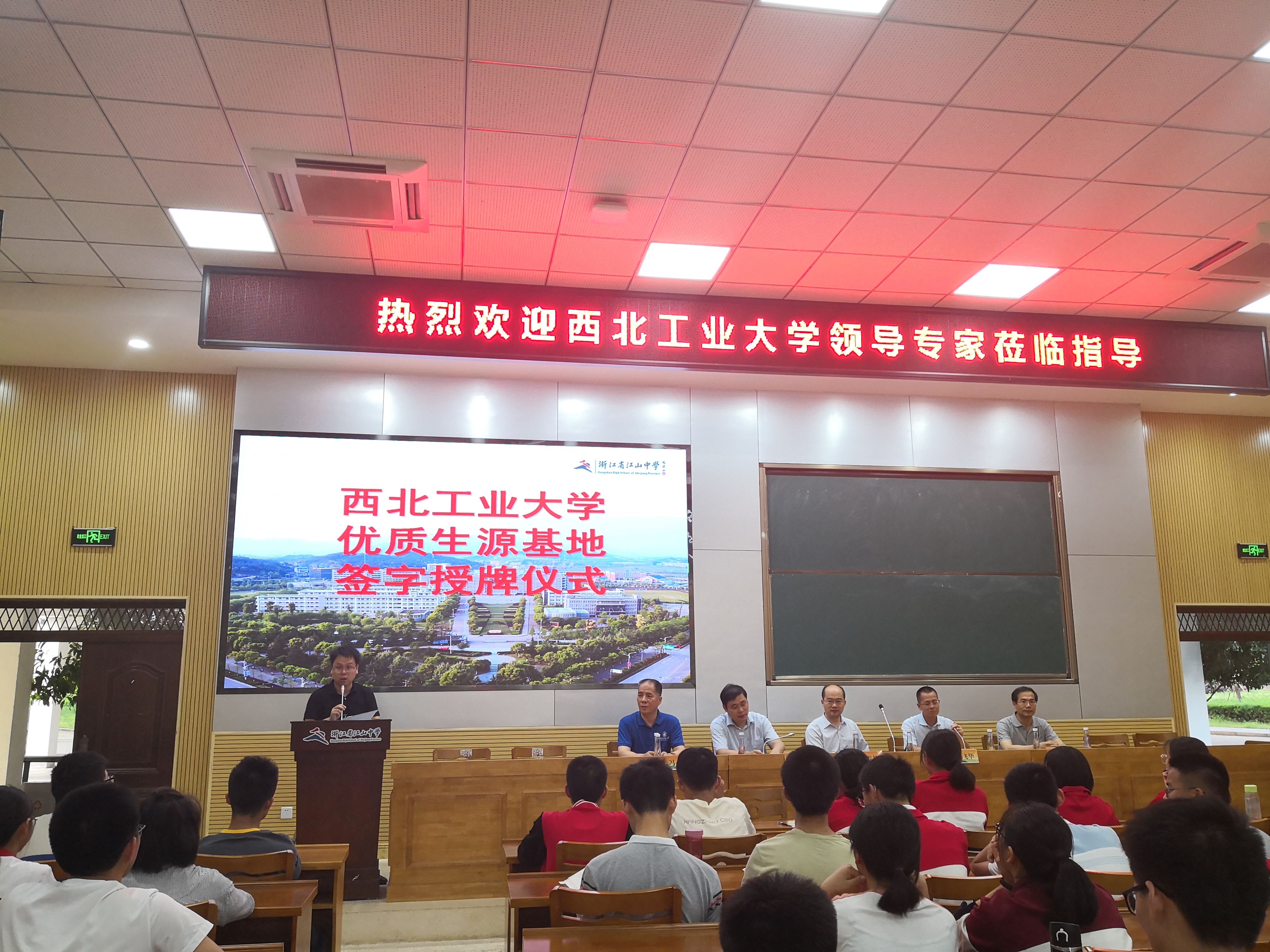 授牌仪式上,夏飞华校长对我校一行老师的到来表示热烈的欢迎,并特意向到会师生及家长提到西工大的发展历史,他说江山中学和西工大去年同时迎来80周年校庆也是两校的缘分。李春林书记向永嘉中学多年来为我校输送优质生源表示感谢,西工大将以优质生源基地为平台,积极支持江山中学的教育改革,拓宽双方合作渠道,推进双方更深入广泛的合作,争取有更多优秀江中学子考入西工大。