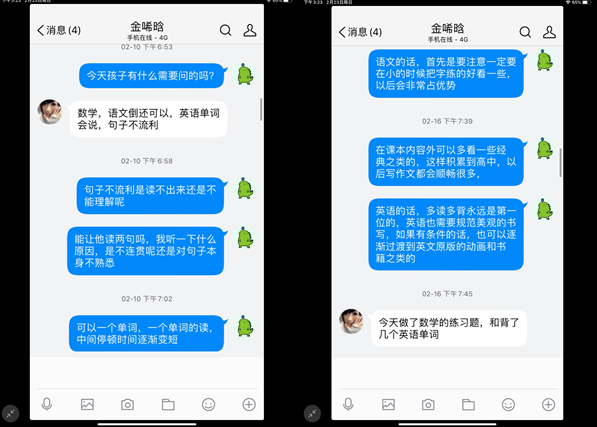 2019级本科生刘晓锐参加了为医护人员的子女提供家教服务的志愿活动。自2月8日起,她便开始了一对一辅导,服务对象是一名初三学生。每天,刘晓锐都会根据他的学习情况给他制定学习计划,督促他按时完成。除此之外,刘晓锐还会通过语音电话的方式为他解答学习、生活中遇到的问题。