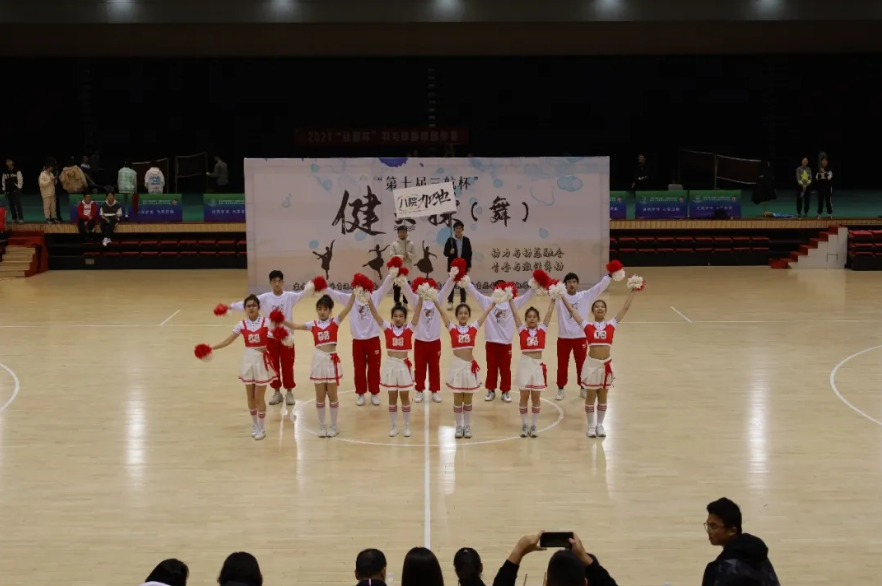 的同学们穿着红白相间的队服尽情舞蹈,以整齐划一的动作,强健优美的舞步,自信从容的姿态获得了在场师生的一致好评,观众的掌声连绵不断。