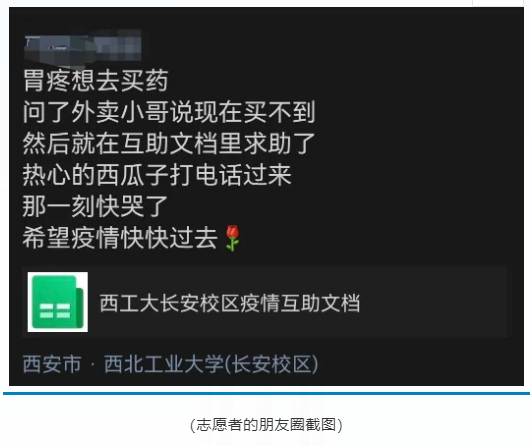 我们的志愿者也有自己的感想:疫情当前,作为一名普普通通的大学生,能发挥作用真的很开心,哪怕是一点点。上午计划敲定,中午分头行动。大家的目标一致,效率真的没的说。队长的负责,队员的认真,工作人员的配合,同学们的乐观,最终铸成本次活动的顺利进行。听闻老师同学们的问题一个个被解决,看着一条条加油话语不断的刷新增加,让我真正意识到志愿活动的意义,意识到志愿队的意义。西安青年在行动!