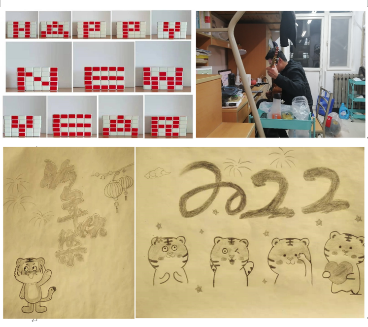 杨啟明老师班级,有同学用5阶魔方拼成“HAPPY NEW YEAR”,用吉他演奏《新年好》,有同学以画会友,将对2022的深情愿景融入画中,在“云”端同学们共同表达了对2022年美好的祝愿。