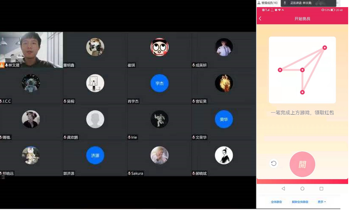 林文晟老师班级,同学们通过线上语音,互道新年快乐,还通过一笔画红包绘制了西工大标志性的飞机图案,祝福学校在新的一年里发展更好。