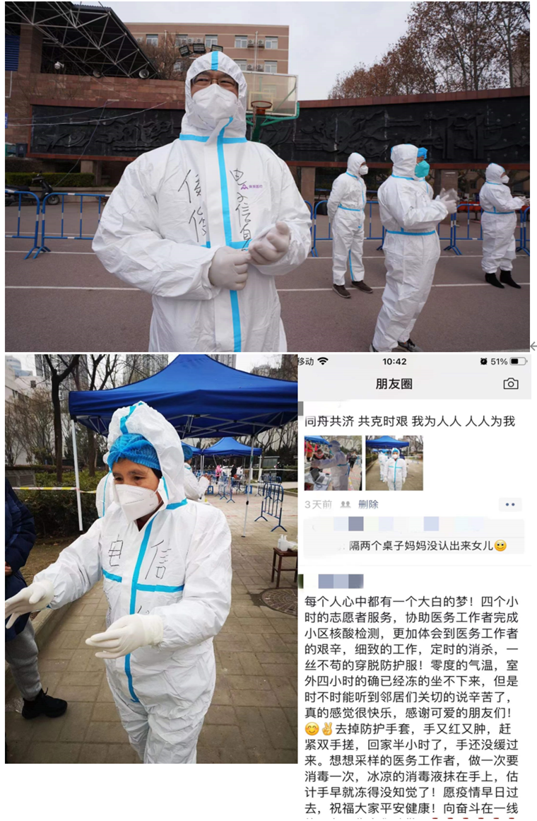 的教师在群里发出的信息:“给我留一个名额”、“要为疫情出一份力,志愿者的名额太难了,要用抢的,稍晚几分钟,名额就满了”。此时的我们,心里没有惧怕,反而是像一股麻绳儿,紧紧拧在一起,一句简单的“工大加油”、“西安加油”,蕴藏每个人此时积攒许久的情感。每一个字,在那一刻如此动人,浇灌着我们的心底,为按下暂停键的西安点亮了一盏盏温暖的明灯,这种舍己的大爱,怎么赞都不为过!