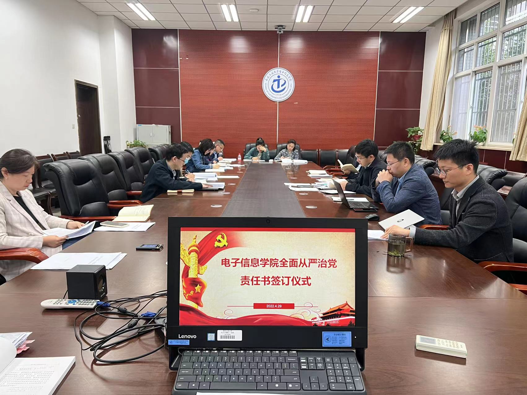 在119会议室举行《2022年全面从严治党责任书》签订仪式,学院党委书记侯俊同志现场与全体新一届党委委员逐一签署了全面从严治党责任书。
