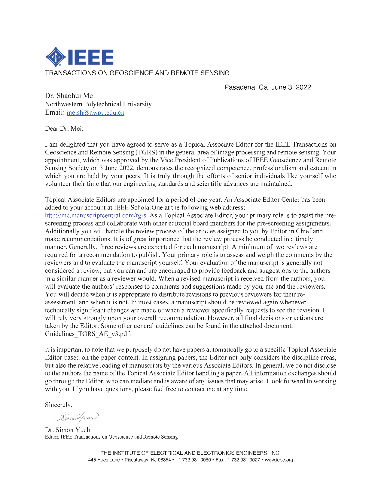 梅少辉副教授被美国电气和电子工程师协会(Institute of Electrical and Electronics Engineers,IEEE)聘任为旗下学术期刊IEEE Transactions on Geoscience and Remote Sensing (TGRS) 领域副主编(Topical Associate Editor)。