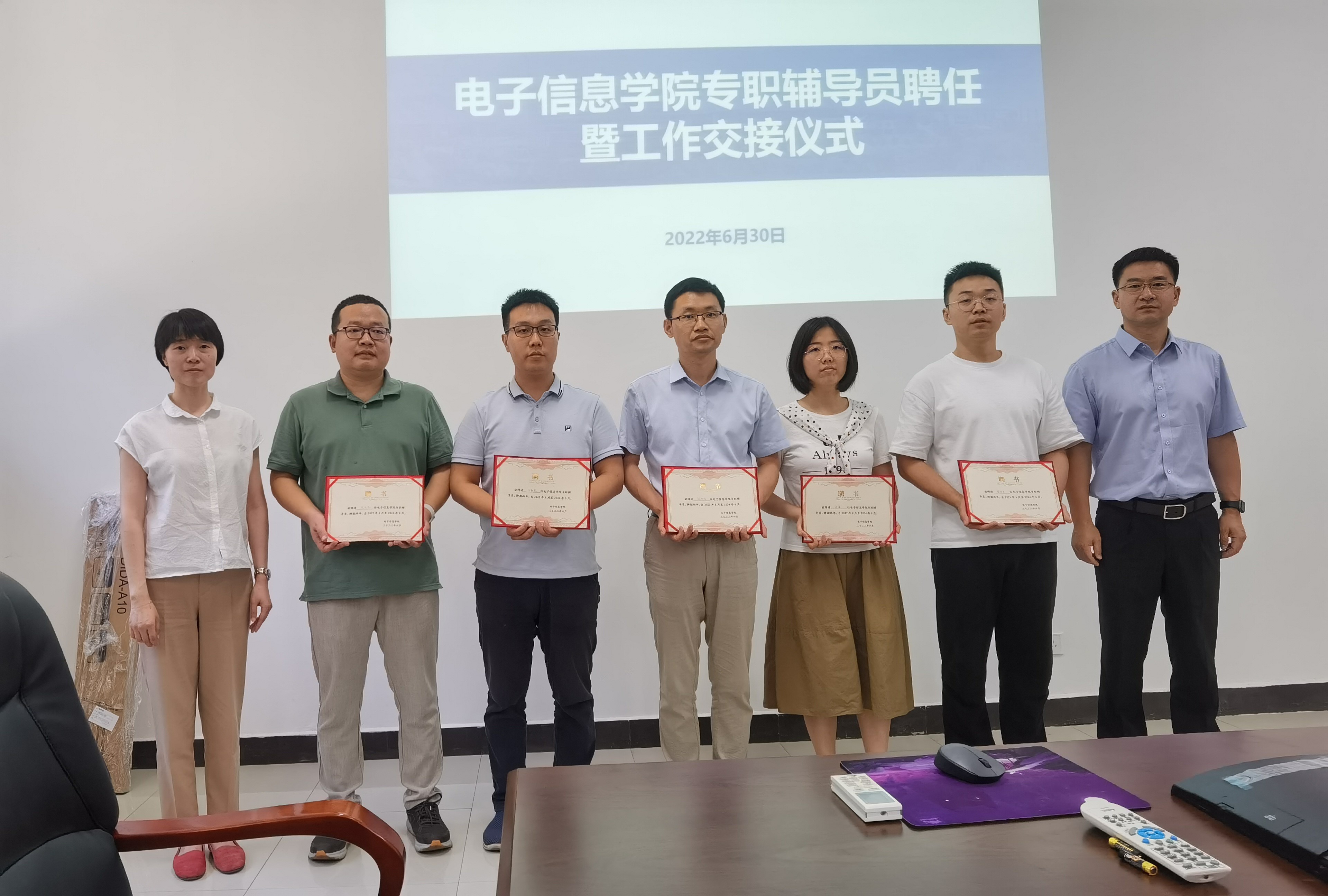 委员会关于加强新形势下辅导员队伍建设的实施意见(试行)》以来,学院党委高度重视,选优配强辅导员队伍,确保了学院人才培养工作有序健康开展。2020年6月12日起,经学院党委会批准,由樊晔、粟嘉、冀璐阳、李永康4名同志担任新一轮的专职辅导员。两年任期内,4名同志加强理论学习,转变工作角色,在学生思想政治教育、党建团建、学风建设、创新创业、就业指导、心理健康教育等方面开展了卓有成效的工作,为学院和个人争得了党建先进学院、互联网+优秀指导单位、“辅导员年度考核优秀”“十育人先进个人”等一系列荣誉,感谢即将卸任的4名专职辅导员的辛勤付出;同时,她代表学院党委,对支元杰、翟伟乐、许茜、吕勤毅和刘向阳5位同志能够克服自身困难,积极参与学院工作表示感谢。