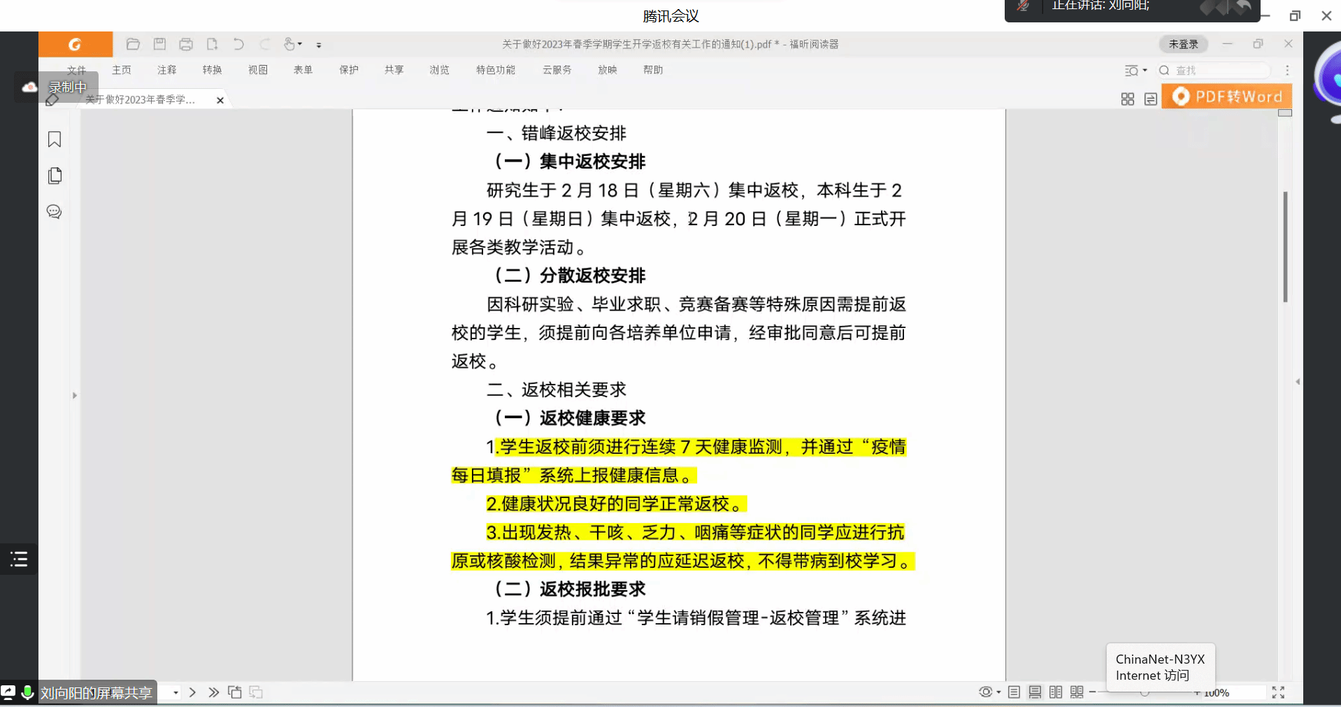 首先,辅导员刘向阳针对寒假期间社会实践相关问题,要求同学们合理安排剩余时间、及时完成相关工作、圆满完成一次高质量的社会实践活动,并及时做好实践总结。其次,结合学校《关于做好2023年春季学期开学前工作的通知》要求,从返校时间与方式、返校健康要求、返校报批要求、返校中途防护要求等方面,详细介绍了返校工作的具体要求,强调了同学们返校过程中的注意事项。