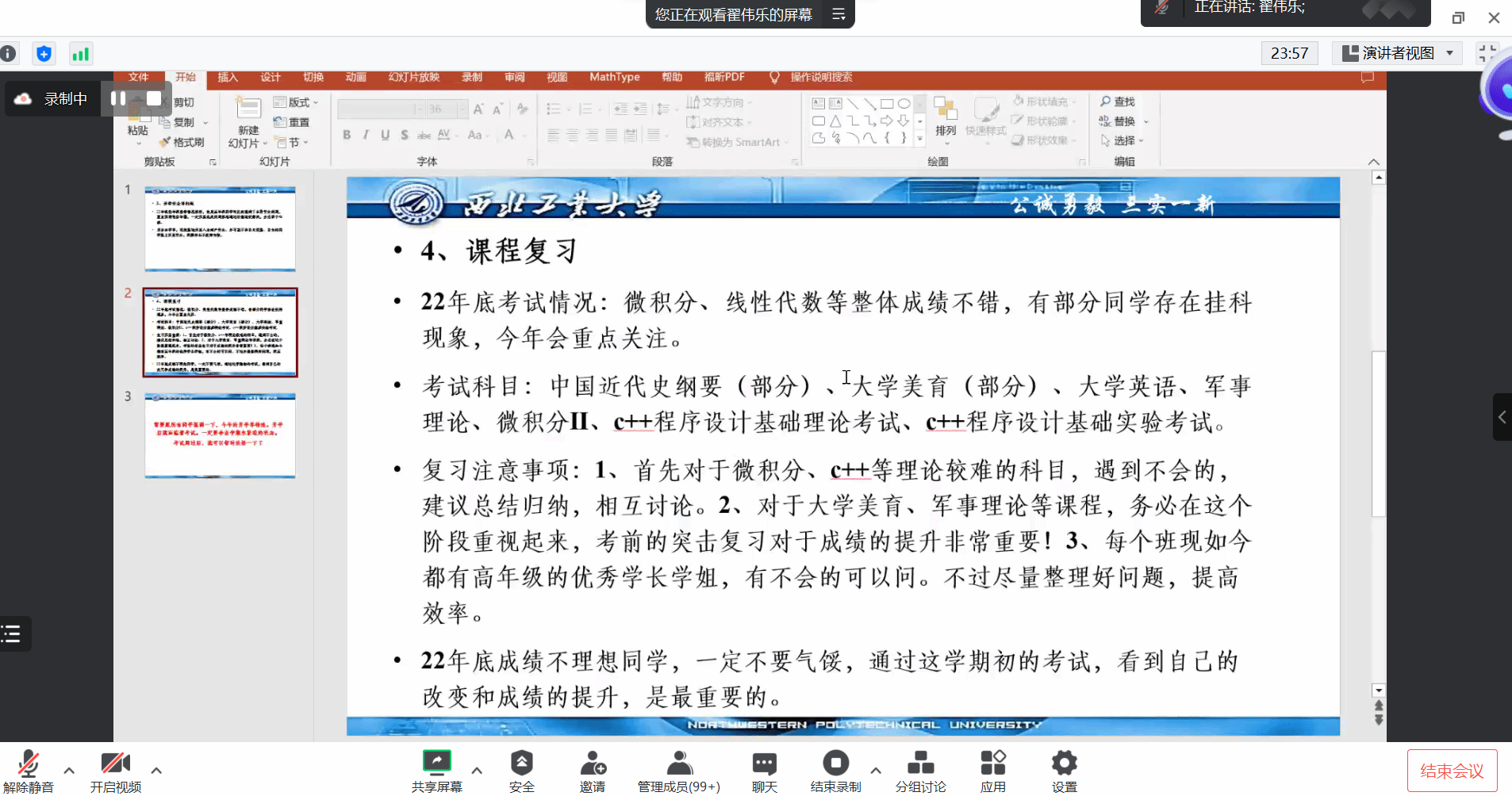 然后,辅导员翟伟乐结合上学期学业成绩、前两周考试安排等情况,鼓励同学们加紧复习、积极备考,合理安排剩余时间与精力,及时调整学习方法与学习节奏,争取在前两周的考试中取得满意的成绩。同时,再次强调了返校过程中的安全问题。