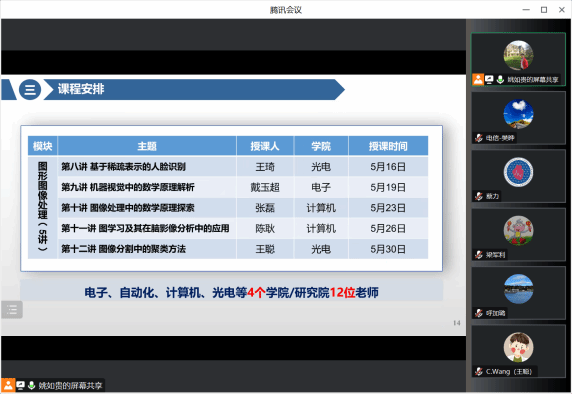 、自动化学院、计算机学院、光电与智能研究院等4个单位12位老师共同打造,讲授通信信号处理、信息融合、搜索与挖掘、图像视频分析与理解等关键技术,包括信息与控制、图形图像处理等内容。希望通过本次授课,能够帮助学生了解信息领域的新技术,掌握复杂问题的解决思路和方法,提升学生的科学素养和科研能力。